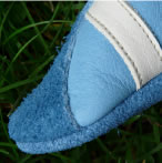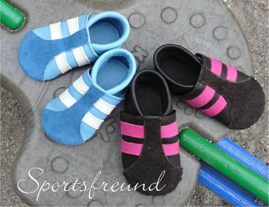 Schnell flitzen können sie, die Kleinen, zwar mehr gerudert als gelaufen, aber an den Füßchen tragen sie schon die ersten Streifen ihres Schuhlebens. Die hochgezogene Kappe, auch rutschfest zu haben, sorgt für besonderen Schutz und Schick. Ein Gummizug um den Knöchel hält den Schuh am Fuß.